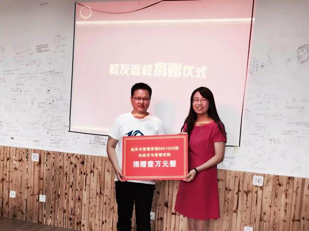 校友与许静书记和马珩老师一起,重温班会,并向老师献上鲜花,表达对老师最真挚的感谢和祝福。校友还向学院“玖基金”捐款一万元,作为在校学生的助力资金,以帮助在校学生更好的创业和发展。同时,0901502班与2013级会计专业在校生结成了校友导师班,以便更好地为学弟学妹提供同辈之间的专业解惑、职业生涯规划指导。校友还参观了学院大楼、院史馆、学院图书馆,并在老照片前寻找10年前自己的青春模样。