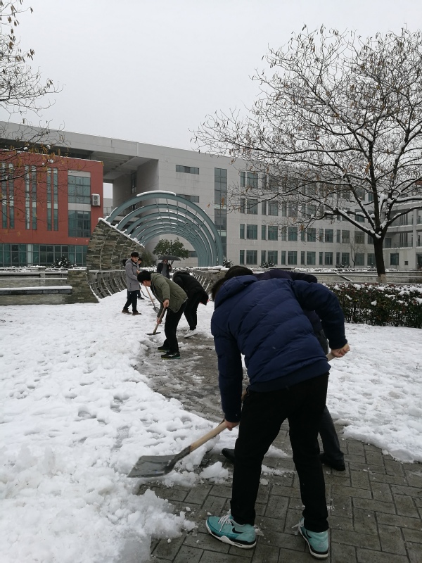 人多力量大,在辅导员袁颖的有序引领下,不一会儿路面上的积雪就被扫开,路边的残雪也被仔细清扫至路牙。大家还注意到通往教学楼的主要通道——东区砚湖的桥上堆积着较深的积雪,有些已结冰,行人走在上面十分危险。在清扫完包干区后,学生党员们又自发地开始为东砚湖的桥铲冰除雪,清扫出一条安全的行走通道。