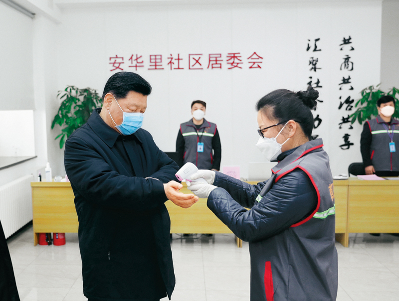 2020年2月10日,中共中央总书记、国家主席、中央军委主席习近平在北京调研指导新冠肺炎疫情防控工作。这是习近平来到朝阳区安贞街道安华里社区,了解基层一线疫情联防联控情况。 新华社记者 鞠鹏/摄