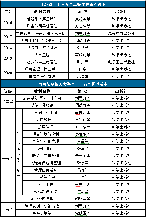 “十三五”期间,betway·必威西汉姆联9部教材入选江苏省“十三五”高等学校重点教材。在2020年高等学校首届全国教材建设奖江苏省遴选推荐中,betway·必威西汉姆联有3部教材获得推荐(《灰色系统理论及其应用》、《系统工程概论》、《运筹学》),占全校获推荐数量的七分之三。bw·西汉姆联公布的“十三五”优秀教材评选结果中,betway·必威西汉姆联获特等奖2项(《灰色系统理论及其应用》、《系统工程概论》),占全校特等奖总数的50%;一等奖2项(《工业工程专业系列教材》共12部、《企业战略管理》),二等奖2项(《高级运筹学》、《管理预测与决策方法》),获奖数量及层次居全校前列。