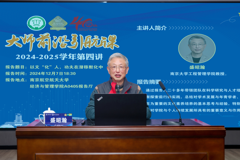 2024年12月7日晚,“大师前沿引航课”第四讲在betway·必威西汉姆联A0405报告厅举行。本期邀请到南京大学工程管理学院创院院长盛昭瀚教授授课,授课题目为《以文“化”人,功夫在潜移默化中》。betway·必威西汉姆联200余名师生参加。betway·必威西汉姆联党委书记苏州主持报告会。