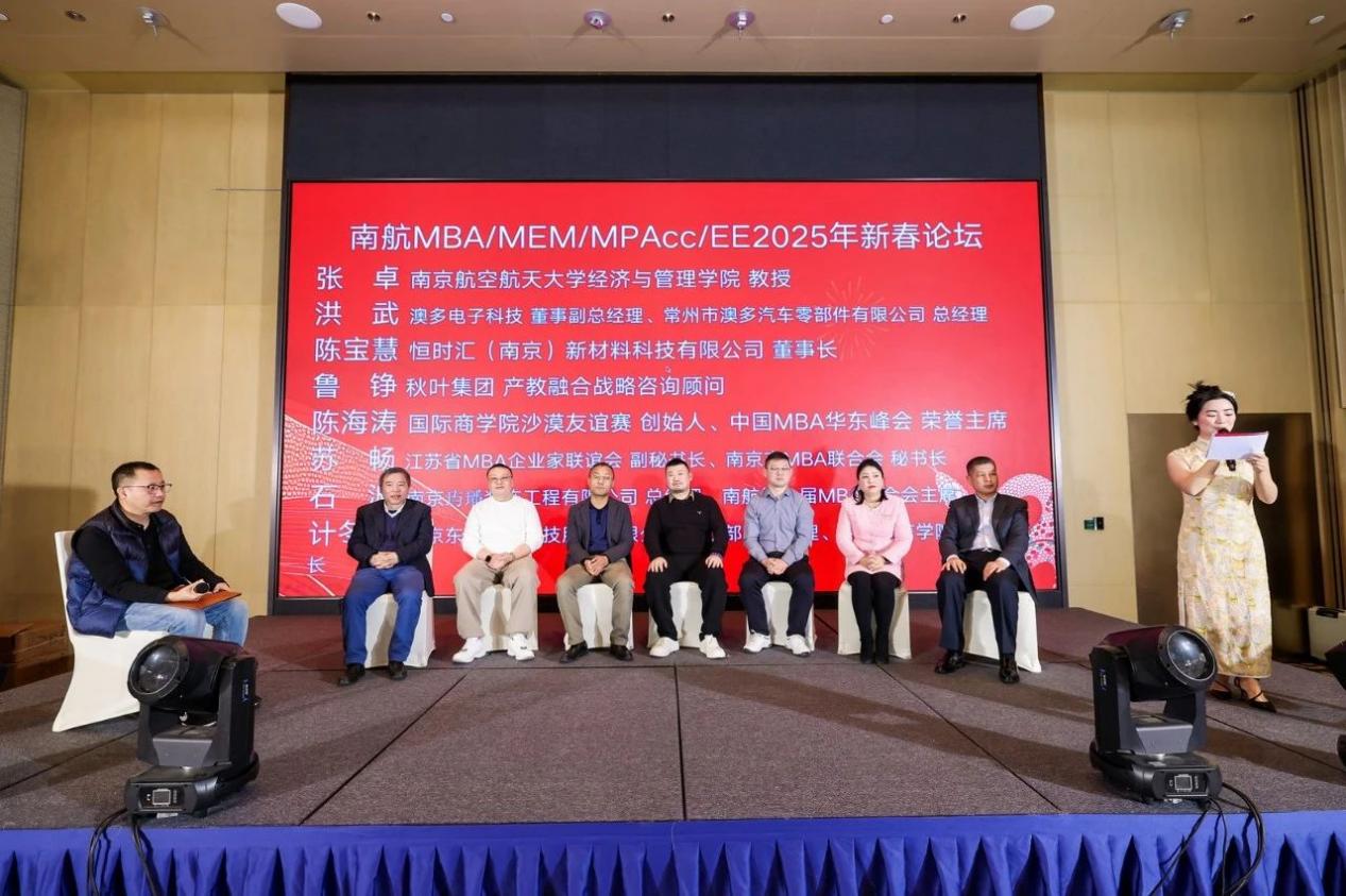 本次圆桌论坛参与嘉宾是:betway·必威西汉姆联张卓教授,澳多电子科技董事副总经理、常州市澳多汽车零部件有限公司总经理洪武,恒时汇(南京)新材料科技有限公司董事长陈宝慧,秋叶集团产教融合战略咨询顾问鲁铮,国际商学院沙漠友谊赛创始人、中国MBA华东峰会荣誉主席陈海涛,江苏省MBA企业家联谊会副秘书长、南京市MBA联合会秘书长苏畅,南京玙璠装饰工程有限公司总经理、南航第六届MBA联合会主席石波,北京东方国信科技股份有限公司事业部副总经理、东方国信学院执行院长计冬冬。论坛主题是《MBA/MEM/MPAcc的责任、创新与发展》,各位嘉宾主要从职业发展和规划、当前经济环境下的发展机遇和挑战、低空经济领域几个方面加以阐述,共同探讨如何在充满挑战与机遇的2025年,以商业智慧为帆、创新思维作桨,探寻破局之道,开创辉煌。