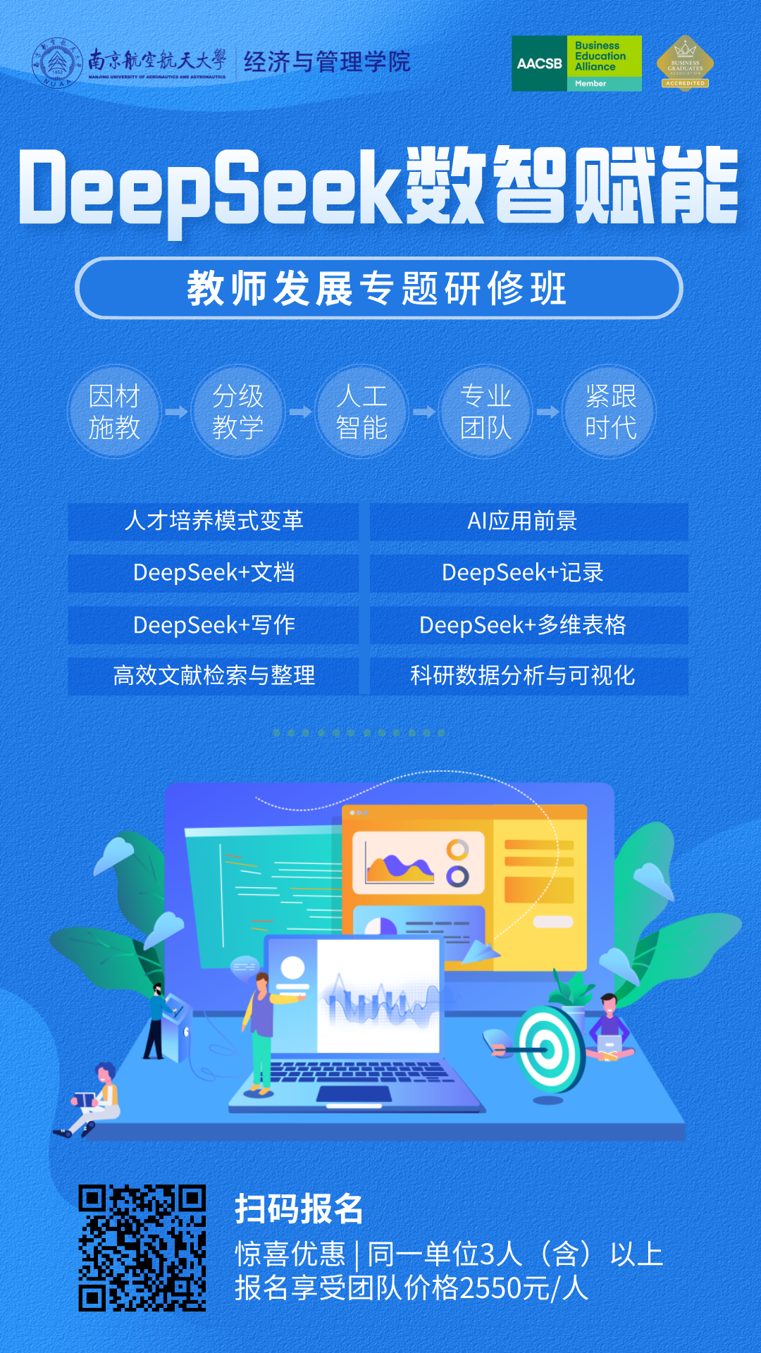 在人工智能技术飞速发展的今天,DeepSeek作为国内领先的AI教育工具,正在引领一场教育领域的智能化变革。通过智能备课、个性化教学设计、自动化助教以及复杂业务流的智能化管理等功能,DeepSeek不仅显著提升了教师的教学效率,还为教育管理者提供了更加科学、高效的决策支持工具。为了帮助广大高校教师和教育管理者更好地掌握这一前沿技术,推动教学与管理的双重创新,betway·必威西汉姆联将举办DeepSeek赋能教师发展专题研修班。本期研修班将结合教育场景中的实际需求,提供可操作、可落地的AI应用方案与案例,助力教育从业者全面提升智能化教学与管理能力。