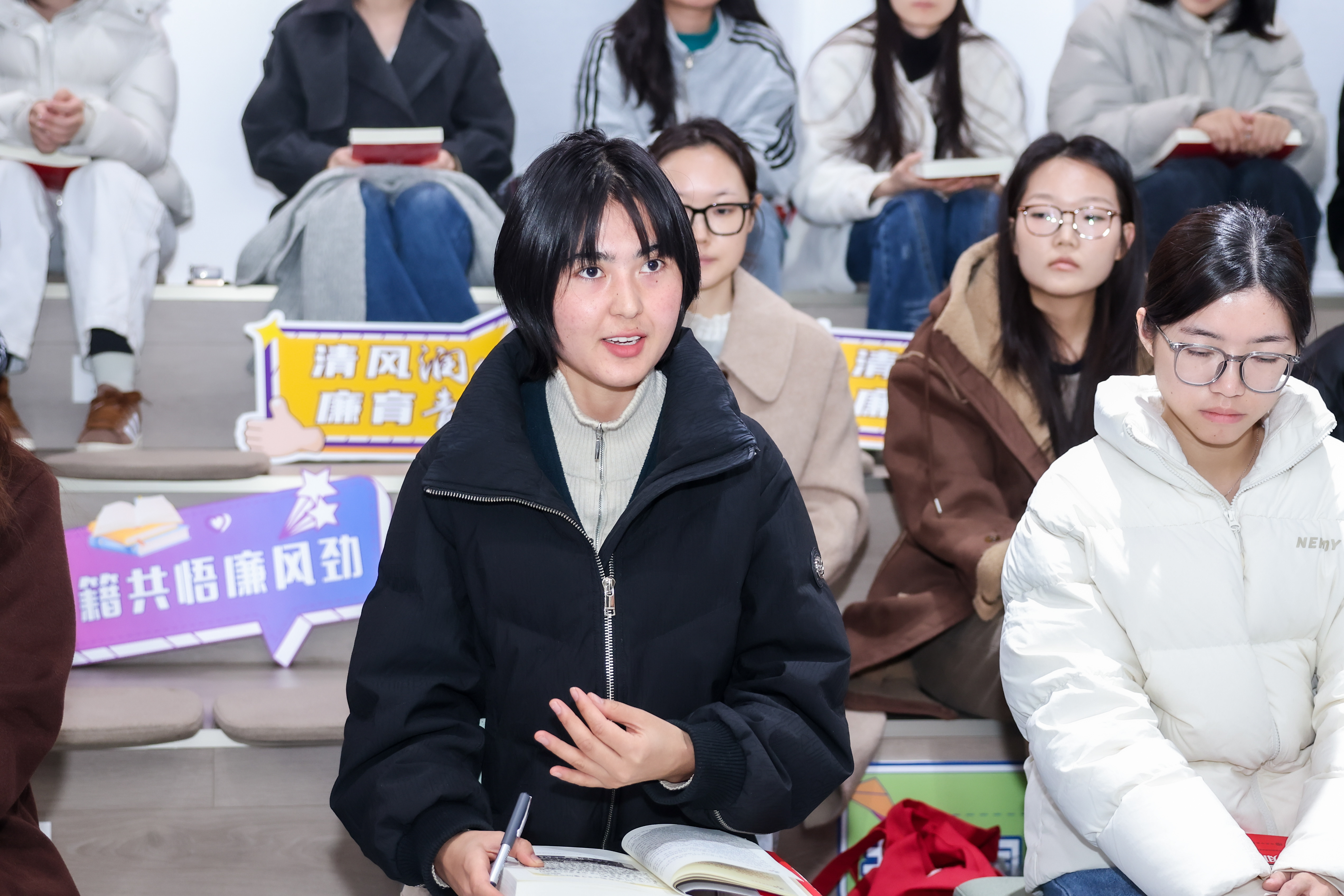 在“廉洁思想共鸣”环节,现场学生积极提问,“班级事务如何处理好人情关系做到公平公正公开”“对于学生来说,廉洁的边界在哪里”等,杭育新与同学们开展了深入交流。